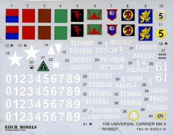 Instructions are superb and remind me quite a bit of those provided by Bronco. Color information is provided where needed in both generic references and those of several paint companies. The seven markings options are all from 1944/45 in Western Europe and all the vehicles are similarly painted in overall British Khaki Drab. The decal sheet is superbly printed and provides a bevy of markings and serial options. I have darkened the scan of the sheet so you can see the white parts of it.