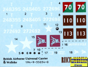 Instructions are superb and provide color info where needed in both generic references and those of several paint companies. The three markings options are from either Market Garden or the Rhine crossings where there were airborne assaults. All the vehicles are similarly painted in overall British Khaki Drab with white stars, differing only in serial number and unit markings. The decal sheet is superbly printed. I have darkened the scan of the sheet so you can see the white parts of it.