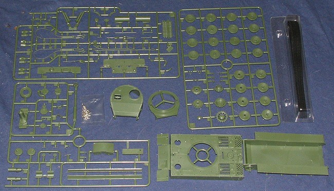Molded in a dark green plastic, the Skybow kits are packaged in what seems to be the same boxes that are used for these large scale military dolls....err....action figures....uh....collectible military figurines. The kit is inside a vacformed plastic container with a form fitting cover. It has two compartments, one with the hull and turret bits, one for the smaller sprues and there is a lower section so the longer sprues can have room as well. A separate plastic container holds the vinyl tracks. A small bag of screws and the instructions complete the kit.