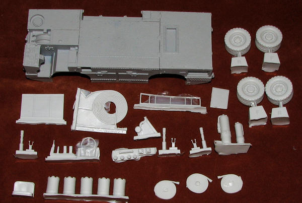 The tires/wheels are handed as to left or right side and are so marked on the pour stubs. There are no axles that I could see and so you will need to make some out of metal rod and drill the body for them as well as the wheels. The rest of the resin parts are as nicely done as the body and include hoses, fire bottles, spare drums of foam, driver's seat, steering wheel and a number of other bits I could not identify. Also included are sections of solder for the hoses (nozzles are resin), wire for grab handles and a section of copper screen for the engine cooling grilles. You also get some pre-formed rings for tie-down rings.