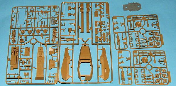 As this is a radio vehicle, it comes with a full suite of radios for the interior as well as the antenna array. Typical of any tracked vehicle, there are an array of road wheels, idler and sprocket gears to assemble. The tracks are link and run type to provide the sag needed for the upper portion. The instructions are quite specific on installing these. There is a rather small lower chassis section made of cast metal and already primered for painting. Since it is pretty much covered by the rest of the body, its only purpose, aside from an attachment point for road wheels, is to had some heft to the finished model.