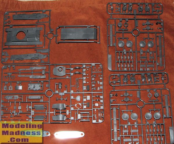 The tracks are link and length with the single pieces molded as to fit around the idler, sprocket and forward/aft road wheel. The road wheels all have rubber rims so the builder will probably need to alter the construction sequence or paint as the kit is built. The upper hull section has separate front and side pieces with a machine gun fitting into the front. Engine covers are separate but there is nothing to see inside the hull. A nice selection of pioneer tools is included along with various tool boxes. Spare track sections and a muffler is provided to add to the busyness of the hull.