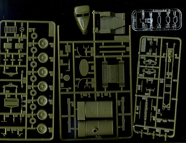 Molded on four sprues of which three are an olive green plastic and one is clear, the kit has the cab section of the truck separate. Clear parts are nicely done though a bit on the thick side for the scale. However, few will find this a problem and it sure beats no clear bits as on some or acetate as on others.