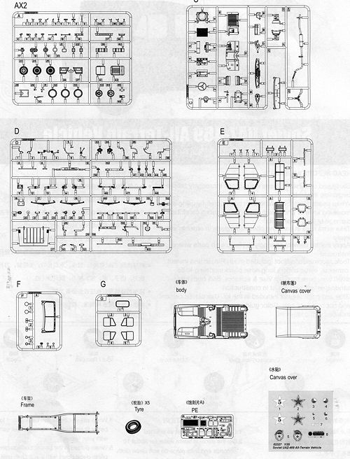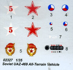 Instructions are clearly drawn with additional detail areas to help with assembly. There are three markings options. One is an overall Olive Green version with big red stars on the doors, similar to what is shown on the box art. Next is a Czech version with large black areas over the green. The third is in a pattern of Green, Blue-Grey, and Brown. No specific unit information is provided with any of the markings options. The white star decal with the number 5 in it is not shown on the guide. A range of color manufacturers is provided to help with painting.