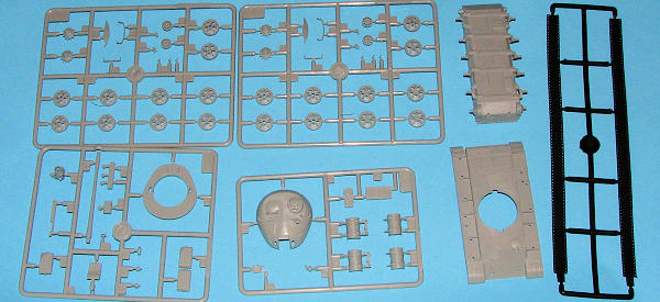 Trumpeter's kit come with four small sprues as well as a separate upper and lower hull section. Two of the sprues are identical and pretty much for running gear. The other two contain the parts for the turret and all the bits that fit on the hull. The gun's barrel is hollowed out so it looks like slide molding was used on this kit. The treads are the single 'rubber band' type. Trumpeter states that these can be attached with regular cement and that paints will stick without flaking off. Sounds like deformable styrene to me.