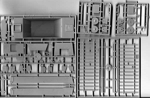 The other part of the kit is the railway car for the tank. There are four grey sprues for this one, with two of the sprues being identical for the wheel set. A typical European car, it has but four wheels. There are two sections of track to put together on which to display the car. The main body of this car is rather liberally covered with ejector pin marks. Now if you are going to keep the tank in it, some of these will be covered up, but others will not and so they will have to be removed. There are some on the side pieces as well as the ramp sections. A few sink areas are also on some pieces. This is all in all, pretty typical stuff for these sorts of kits and those building them will have experience taking care of these minor issues.