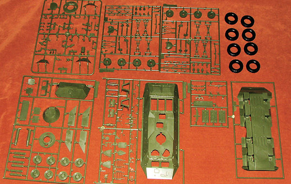 A sheet of acetate is provided to place behind the driver's windows. Eight tires are included. These are a very hard material that is not quite styrene and not quite vinyl. Each tire has several ejector pin marks on one side, some of which are quite deep. The kit's hatches are separate and while not shown as such, could be posed open. There is no interior detail.