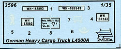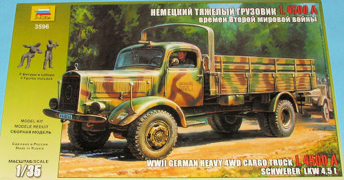 The heavy 4.5 ton cargo truck L4500A, originally developed for civilian use, was widely in service with German army units during WW II. Serving on all fronts, a total of 9,500 were built between 1939 and 1944, the majority of these going to the army. The L4500 was powered by a 7.2 liter diesel engine producing 112 horsepower. There were two basic versions of this truck, the 4500S two wheel drive and 4500A four wheel drive version. (History section from kit instructions)