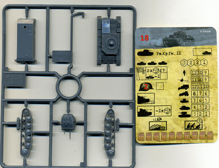 This is another of Zvezda's war gaming kits and is in 1/100 scale. This seems to be the default scale for Zvezda for armor in order that the tanks won't be too huge on the game board. Anyway, there is one very glossy sprue of plastic and a movement card included in the square box. The packaging shows that these kits are designed to hang from a display rack in stores.