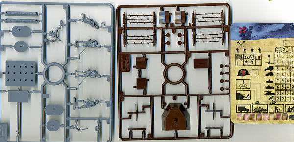 This is another of Zvezda's war gaming kits and this time it is a 1/72 kit, which is what they use for figures and artillery. Like others in this series, the figure set includes an individual base for each figure as well as what appears to be a group base. The set also includes a bunker, four barbed wire sections, what looks like sandbags and a pair or tank obstacles. In addition, there is an ID flag that fits into the bunker and another for the mulitple figure base. As with others in this series, there is a movement card.