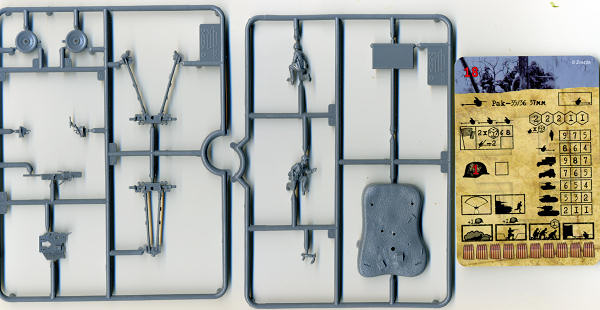 This is another of Zvezda's war gaming kits and this time it is a 1/72 kit, which seems to be the standard they are using for artillery. Like others in this series, it is light on parts and includes a base and a pair of figures for manning the gun. In addition, there is an ID flag that fits into the base. As with others in this series, there is a movement card.