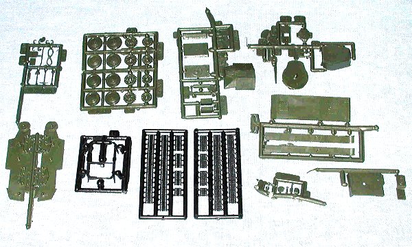 The small box has a within it a newsprint instruction sheet, a sliver of a decal sheet and a big of green and black parts. All of the sprues are rather small and most show some flash and relatively large parts attachment points. You'll be using the razor saw on many of them. Detailing looks fairly good to me and it appears that there are some optional parts. It will be interesting to see how those flat tracks are to be bent over the fore and aft sprockets as they are not rubber. However, the plastic does seem a trifle softer than usual so perhaps careful bending will get them to conform.