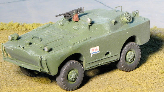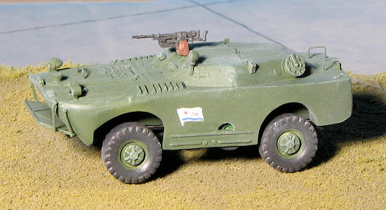 "The BRDM-1 amphibious scout car first appeared in the Spring of 1959 and was designed by VK Rubtsov of the Dedkov OKB who later designed the BRDM-2. The first prototype was completed in February 1956 and went to the Black Sea area for official government trials. It was accepted for service with the Soviet Army the following year and production began late in 1957. The BRDM Model 1957 has an open roof and the BRDM-1 Model 1958 has a closed roof with twin hatches, this being the standard production model. Total production of the BRDM-1 is believed to have amounted to around 10 000 vehicles.