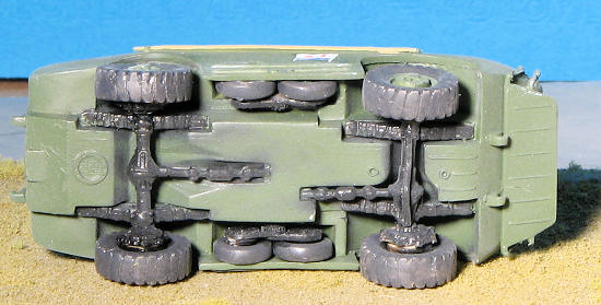 I used French WWII khaki green as it was a good match for the box art. The running gear was painted black as was the back of the wheels. I used the upper surface color for the outer wheel hubs and weathered black for the tires. I did have to do some major brush painting to take care of overspray, but wasn't really concerned about all that. This is, after all, a kit of doom production. For markings, I applied the Navy decals. These are translucent and easily torn so the one on the front was not attached as it got trashed. A coat of matte clear was applied.
