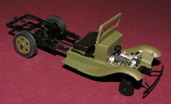 With all the engine bits in place and a decent chassis fit, I went to work on the interior. The two piece seat was built up and painted. A hole has to be drilled for the hand brake. Two holes are shown needing to be done, but the one for the gear shift is already in place. The cowling section needs to have the instrument panel piece glued in as well as two tiny foot pedals. Gluing in the cowling piece was easy enough as was threading the steering column. I then cut out the acetate windscreen as I knew I'd not be able to get it installed later. At this time, I glued in the acetate for the doors and the rear window. This was held in place by clear gloss paint. I found that the acetate pieces were not precisely keyed to the openings. The front and rear pieces were too large and the doors too small. Thankfully, clear paint will do an admirable of covering the gaps for the latter.