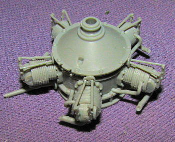 While that was drying, I started work on the engine. I have to say that Trumpeter went all out to make this about as many pieces as they could. The case is three parts, then there are five parts each of cylinders, cylinder mounts and small plates for the pushrods. Three cylinders get exhaust stubs while there is a collector of sorts for the bottom two. Next, each cylinder gets two small spark plug cables and each cylinder gets two push rod assemblies. It all makes for a lot of small work so break out the Optivisor. There is a back plate that one needs to carefully install else you will get it on backwards. Ask me how I know!