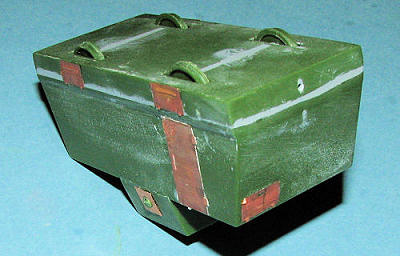 With basically all the bits in place, everything was painted in Russian Armor Green. It seems a bit dark to my eyes, but later dry-brushing (I used a light grey and light green), were able to brighten things up a bit. The guns and bumpers were painted black. I then realized I'd forgotten to put on the large vent piece. This was trimmed and the vents opened by grabbing them at the hinge line with a pair of flat nose pliers then running a thin piece of sprue behind them to open them up. When one does this, start at the bottom and work up or you'll run out of room to hold on with the pliers. This was glued on and the area painted again.