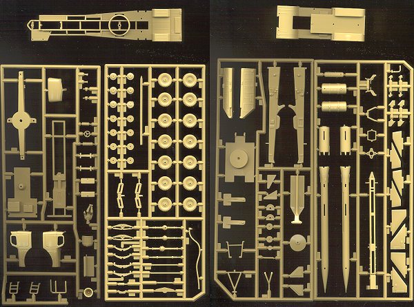 The kit is rather complete and provides basically four majorassemblies. There is the missile itself, the truck, the trailer and thelaunching stand. Each of these is a small kit in and of itself, witnessed by thefact that there are 125 pieces to this kit, most of them less than large! Thereare no transparencies for the truck so you will have to make those out of clearacetate sheet or just leave them open.