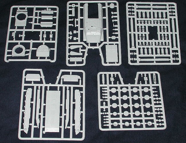 This kit is very much like others of its genre in that a large number of the pieces are devoted to the wheels and tracks as well as the various hooks and hand holds. The tracks themselves are made of two lengths of straight track and a number of single tracks for those that must wind their way over the for and aft sprockets.