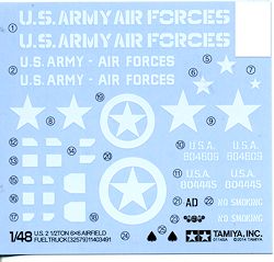 Markings are included for two similar overall olive drab trucks. It is pretty obvious that these are meant for the European theater and probably for an English base. I would think that if operating in the Pacific or on the Continent that they would not have the 'US Army Air Forces' logo on them, but I could be mistaken so check references.