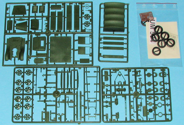 There are four green sprues, a bag that includes vinyl tires, the small etched fret and a sheet of acetate with the headlights and windows outlined on it (also not shown). The larger parts have a slightly pebbly finish to them. This is not carried over to the rest of the bits and pieces. Though not consisting of a lot of bits, there are some that are not required for this particular build. The kit comes with a complete engine and it is on this that quite a bit of the photo etch is used.