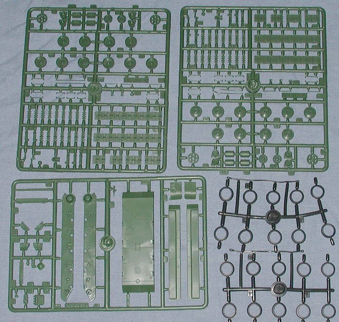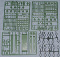 Once again, one is confronted with five medium green sprues and two vinyl ones. The parts are well molded without flash, but with some sink areas and ejector pin marks. The tracks are in sections with single links for going around curved areas of the sprockets and road wheels. The road wheels each have separate vinyl 'tires', which eliminates the tiresome painting of road wheels that goes along with many tank kits. Some of the parts are not used in this version, which is pretty well standard with kits for which there are multiple variants. This one seems to have four sprues of 'standard' T-34 with a separate sprue for the new turret and gun. Each of these kits includes a small etched sprue to help dress things up a bit.