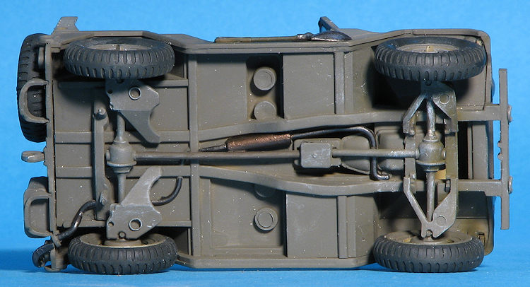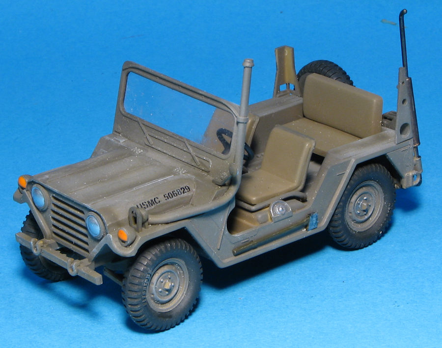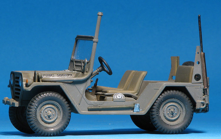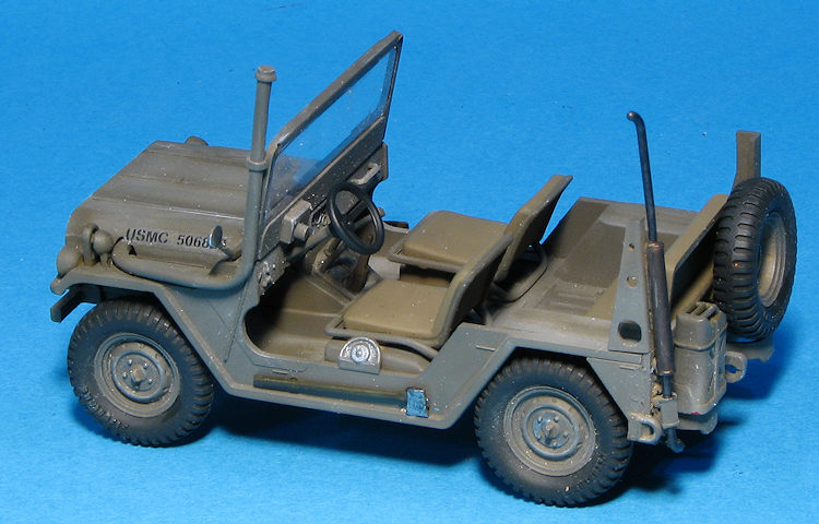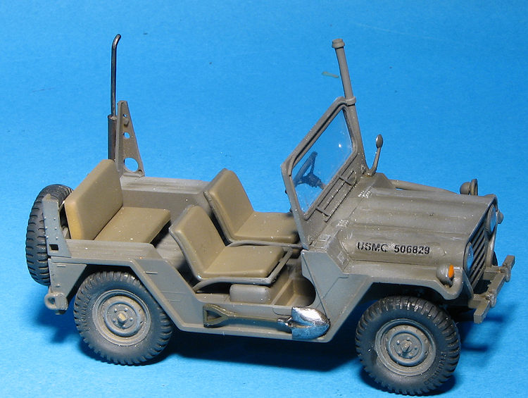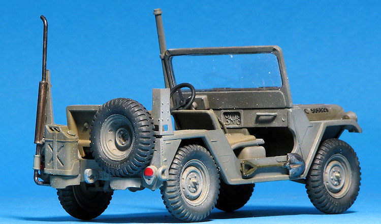 A driver is provided and there is a post mounted machine gun (M-60?) that fits behind the driver. If you don't want this feature, you'll need to fill in the hole for it. There is also a fording kit with a tall exhaust if that is desired. Other bits that can fit in the back is a radio set on one of the fenders and a rear seat. A cable breaker can be installed on the front bumper as well.
