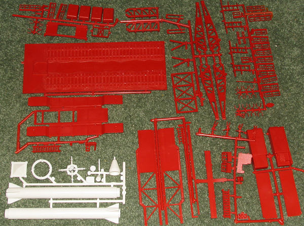 When you open the box, you are faced with a large bag containing a lot of red plastic for the launch gantry and base, and a smaller bag within of white plastic with the actual rocket itself. Typical of Revell kits of the period, many of the parts had managed to work themselves free from the sprues and were floating around inside the bag.