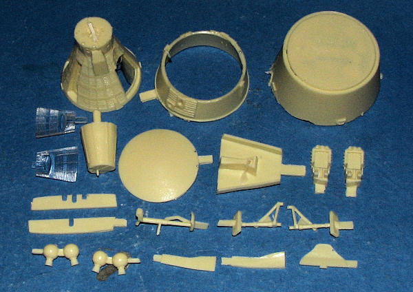 The model can be built one of several ways. One is in full landing position with gear extended. In this form, there is no nose cone and no retro section or equipment section. One can also mold it as it was atop the Titan missile with these latter sections installed. The equipment section has a huge amount of detail molded into it and it may well be that the modeler would prefer modeling the kit 'in flight'. Of course, there is also a re-entry option with the equipment module gone and the retro package shown. No matter how you do it, you will not use all of the parts. The two hatches are molded in clear resin so that the windows will be easy to keep clear.