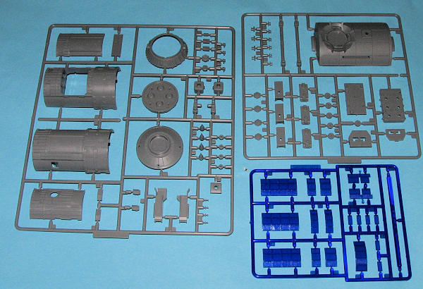 The kit comes on three injected sprues, one of which is a clear blue plastic. This sprue basically contains the solar panels. The quality of the moldings is first rate and basically consists of the body of the module, the payload and the thrusters, of which there are many. The kit comes with a display stand that is molded to be the docking port of the ISS. There is also a robotic arm. This robotic arm is articulated to allow different ways to display the module. Of course, those of us with imaginations can see this arm grabbing the empty module and tossing it earthward to burn up in the atmosphere!