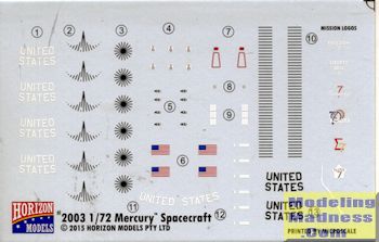Instructions are nicely printed and are located on the back of the box. You can also download a .pdf version to print out from their web site if you so desire. These instructions cover all the differences between the different spacecraft so you can be sure you are modeling your favorite correctly. All the manned craft are painted a metallic blue-black while the boilerplate capsules are considerably more colorful. There is a single decal sheet that has all the markings you need for any of your chosen options, including the names put on all six manned missions. Note that I have darkened the sheet so that the white stands out a bit more.