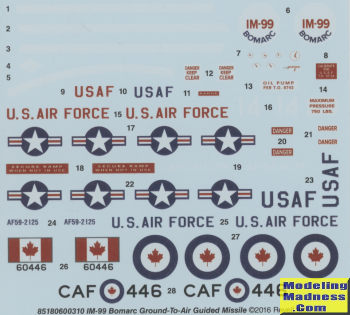 Instructions are very much like they would have been in 1959 and are easy to follow. Generic color information is provided. The box art aircraft is in USAF dark blue with white tips to the flight surfaces. Then there is an overall ADC grey plane of an operational USAF unit and a similarly painted Canadian version. The decals are nicely done and quite glossy. I should note that to me, there is some sort of registration issue with the USAF insignia as the blue seems thicker at the top of the insignia than at the bottom. Perhaps a replacement would be in order.