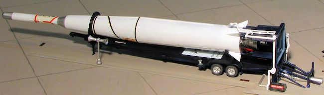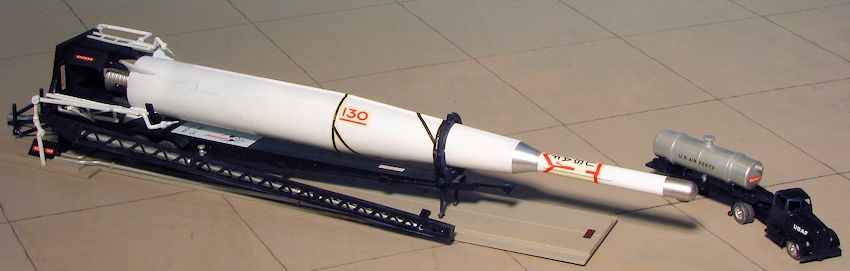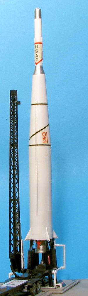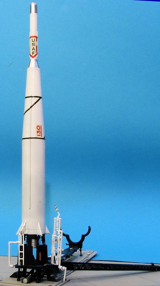 sink areas and seams) or to just leave things go. The kit includes not only the standard ThorA with the rounded nose cap, but also the ability to do a Thor-Able launch vehicle. The kit includes a launch complex complete with transporter and tower. Figures were the norm with these kits and those are also included.