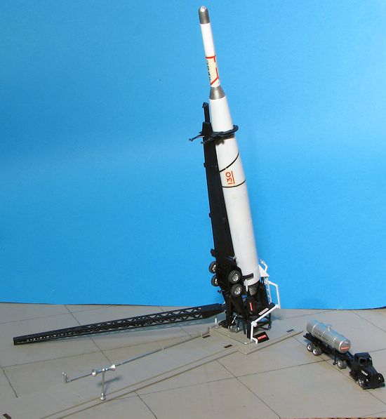 With all the pieces done, there was little left but to assemble the main bits. First step was to install the piston for the erection vehicle and then try to snap it in place. I did manage to break the piston assembly the first time, but fixed it and some other bits broken with super glue. The long fueling tower was next, followed by gluing on the Thor-Able to the launching hold backs. The last piece glued in place was the P.A. assembly. Much to my delight, I was able to actually get the rocket to fit onto the launching trailer and to have the trailer fall back into place. I called it done.