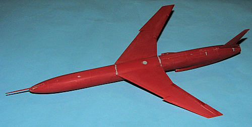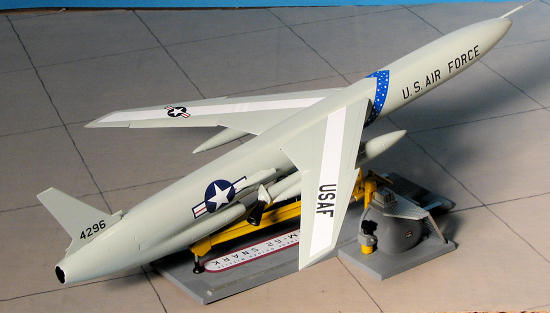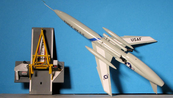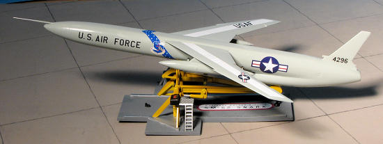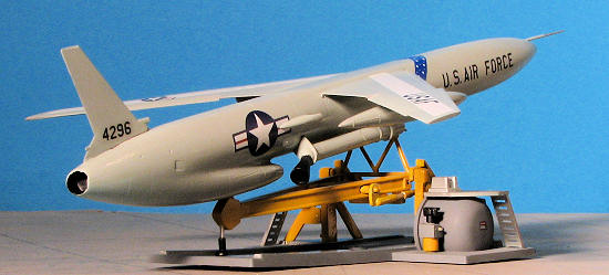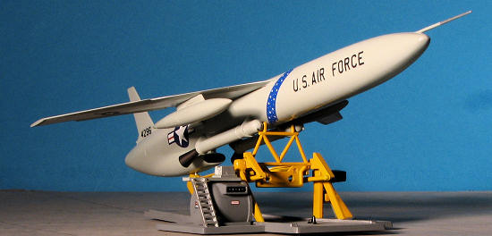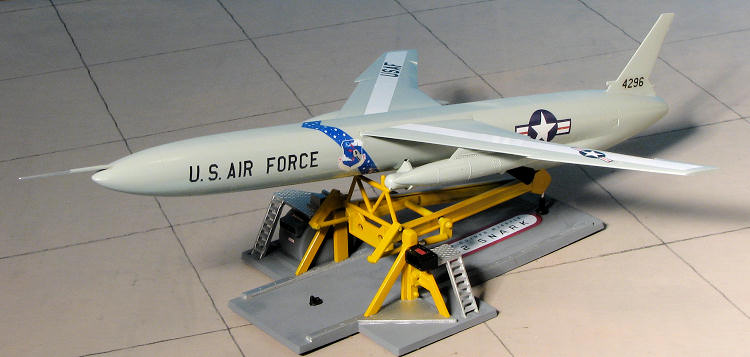 Now on to the base. These parts were cleaned up as well as I could and painted grey. The main mount was painted yellow as were the supports. The large fuel tank was glued to the base and the entire base painted with Dark Gull Grey. The platforms and ladders were painted Alclad II Aluminum as were the side rails on the base. Other bits were painted matte black, using Citadel acrylics. I used this shade on the intake and exhaust of the Snark. The nozzles on the JATO units were brush painted Burnt Iron metalizer. | CONCLUSIONS |