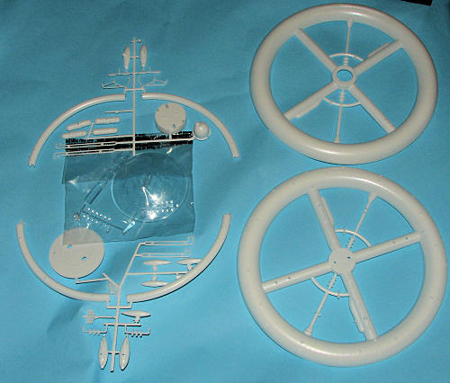 Starting with the Space Base, this kit consists of the two main wheel halves, which have a lot of molded on detail. There is a collector channel that surrounds the one side of the wheel and on the other is a platform that holds the two small space taxis (for lack of a better name). These two smaller ships are basically upper and lower hull with a cockpit. No pilot. There are various tanks and the lone thruster bank to assemble and attach as well as various pipes. This kit has a display base to go along with it.