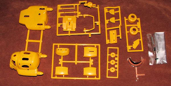 First off, this is not aimed at the 'serious' modeler (whomever that might be) as the parts are in a bright yellow and there are not a ton of them. The kit comes with clear bits and a pair of metal axles. One is for the front wheel and the other for the two rear wheels. There are ejector marks on the wheels that you'll have to remove and some of the other bits have these pesky things as well. For an interior, you get a seat onto which a figure is placed. It was by comparing this figure with some others I have that led me to thing this was about 1/48 scale.