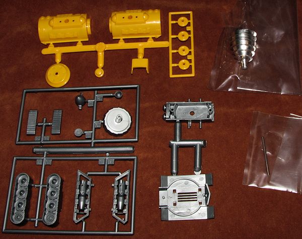 Like the previous offering, this is not aimed at the 'serious' modeler (whomever that might be) as the parts are in a bright yellow and grey, obviously to alleviate the tedium of painting the bits. The drill itself is chrome plated and there is a metal axle included. All of the large parts have the part number embossed on the inside. The four wheels do have some rather large ejector notches in them that the fastidious will need to fill and sand. Of course, these peer from the tracks so not much of them will be seen. No figure is included with this one so there is no way for me to guess at the scale.