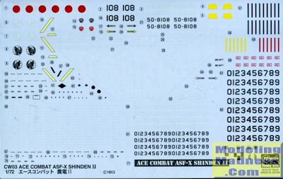 Decals are provided for two camouflage schemes. One is the Air Superiority scheme shown on the box art, while the other is a maritime scheme with the upper surfaces in dark blue. Decals are nicely printed and include weapon markings as well. The white bits (for the maritime scheme) are nearly impossible to see in the scan and you get a variety of optional aircraft numbers. Instructions are typical of modern Hasegawa kits and offer detail drawings as well as paint colors using Gunze references.