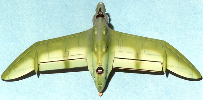 Having decided to do a multi-green upper surface color, the rear was painted with Model Master FS 35337 Israeli Green. The middle section and forward wings were painted Model Master FS 35151 Interior Green, while the nose section was painted with Aeromaster Russian Uppersurface Green. All are enamel paints. This pretty well did in the preshading! The usual amount of back and forth painting then commenced as oversprays and such were touched up.