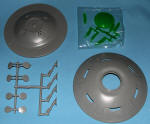 This kit is an interesting concept based on your standard saucer shaped vehicle. It is fairly well molded, though I did notice that each location of the large alignment pins was accompanied by a sink area on the outside of the upper hull. For the rest of the kit, there are four landing legs with pads and four gear doors. The kit also provides the option of building the kit will gear up and has a separate set of doors for that purpose. No interior, of course, and the upper hull has green tinted clear bits for the six windows and the large central dome.