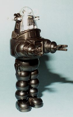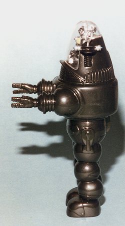 Every non-monster sci-fi movie ever made after that has elementsof Forbidden Planet woven into the storyline, whether the author realizes it ornot. The props for the movie appear in many different places including a largenumber of Twilight Zone episodes. Probably the most amazing and rememberedcharacter from the movie (aside from the then daringly dressed Miss Frances), isthe robot named Robby. Capable of lifting tons of weight and prevented fromharming sentient beings thanks to Isaac Azimov's three rules for robots, Robbyisn't the vicious beast depicted on the box art (which is a poster from themovie itself). Now, if some enterprising company would make a suitable figurefor draping across Robby's arms........ (and someone has. It was Dr. Flintstone and may still be around if you hunt long enough for it.)