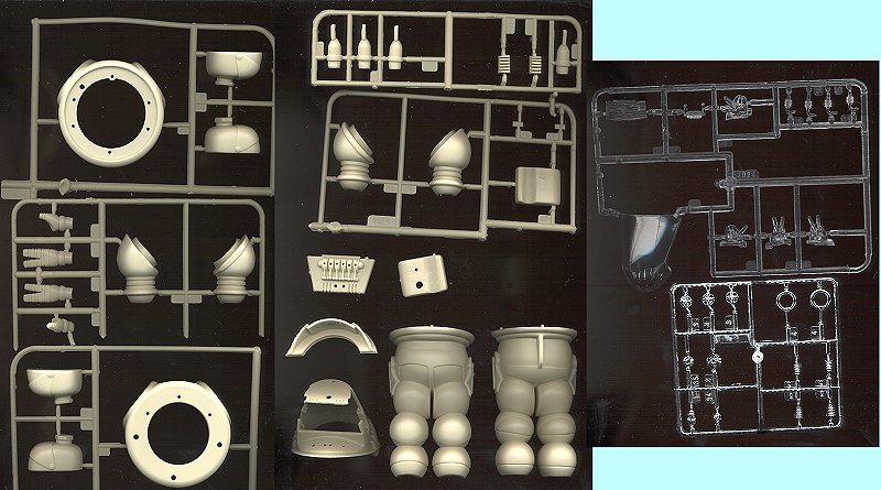 Unlike the Lost In Space robot, this one appears to be a newmold and not reverse engineered. All the parts look clean and crisp with novisible flash and the mold marks where they can be hidden. The chrome parts arewell done, with mold seams small enough to be left on the parts if you are soinclined. The clear parts are sort of bluish in cast with the large domescratched. There are four 'Voice simulator tubes' (part 15) of which they arenot all the same shape. It will be interesting to see if this affectsconstruction.