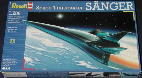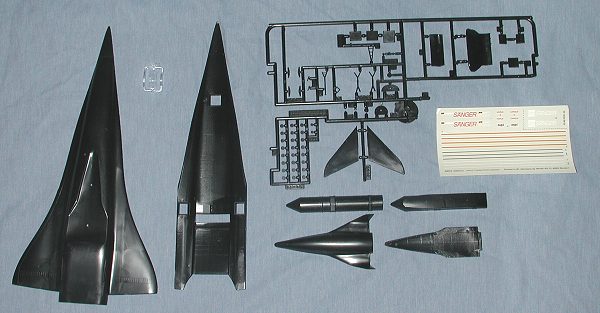 History, shmistory. There isn't any on this kit. It is as much a paper project vehicle as any Luft '46 kit I've ever seen. What it does have is an essence of cool that most of us will react to. The theory behind this is one of a reusable lower stage that carries the spacecraft on its back. It would be able to take off from a normal runway and get the payload vehicle into the fringes of space where it would continue on. The lower section would then return to earth where it could be refuelled and readied for the next mission. Accoring to the box side panel, this vehicle was designed by MBB (Messerschmitt/Bolkow/Blohm). Frankly, I can see one big problem right off the bat and that is the two large fins on the 'booster' vehicle. I'd think that there would be a pretty good chance of the separating upper stage hitting those; but perhaps not.......