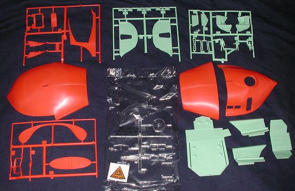 The kit fills the box and is molded in two rather garish colors of orange and light green. All of the exterior parts are in orange, undoubtedly to assist in painting. Interior bits are in the 'puke' green color as are the three figures supplied. A nice clear sprue includes a stand that will be immediately recognized by those of my generation who grew up with Aurora kits. Since there is no landing gear, a stand is a logical inclusion.