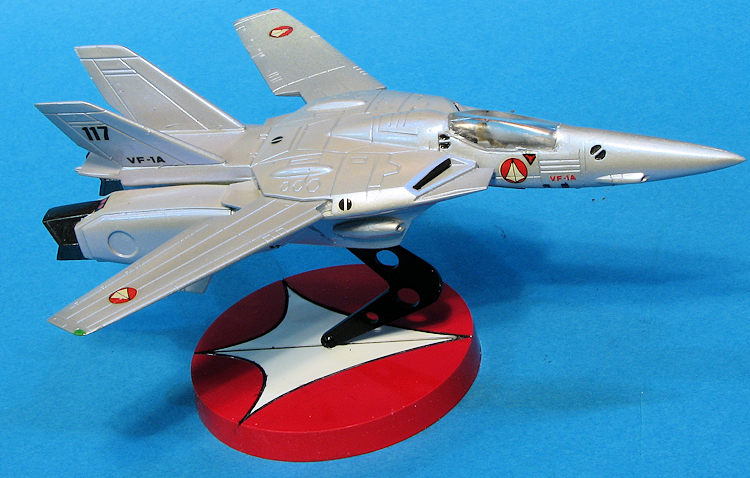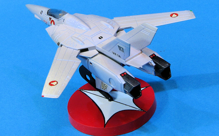 The base was painted gloss white and the center section masked off while the rest was painted TS-8 red from a rattle can. The part that attaches the VF-1A to the stand was painted black (or as Tamiya says 'semi-gross black'. I then brush painted the details on the airframe before applying decals. While there are placement instructions, with a kit like this one can pretty well do things as one wishes. The decals were still quite viable and are a bit on the thin side so care needs to be taken. Microsol was enough to get them to comply with surface variations.