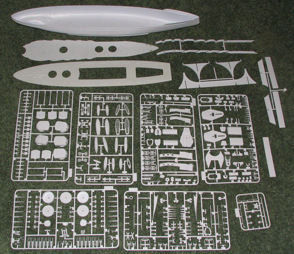 Molded in white plastic, as are most ICM kits, this one comes in a rather large box, which gives the kit parts a lot of room to slide around. The majority of the sprues are in three large and one small bag. The parts themselves are very nicely molded. I looked long and hard for the usual problem areas of sink areas, ejector pin marks and flash. I was quite pleased to not find anything of consequence aside from some very deep sink areas on the prop shaft housings. Some of the parts are very finely done and thanks to the sprues being several to a bag, some of these bits had either broken off or had been bent to where straightening them will result in their snapping. The detail level is quite good and you'll find the usual rivets and the myriad of stanchions, ladders, davits, guns, and various naval accoutrements that one normally finds on ships.