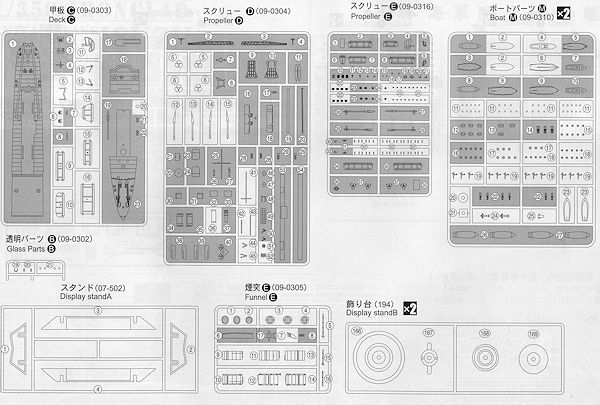 Each of the deck levels is made up of separate slab sides that one assembles and then attaches the ladders and various bit to. Typical of Japanese ships, there are a lot of mounted binoculars at the various look-out posts. The three major gun positions are all held in place with small plastic caps so those can also move in azimuth. All of the ship's searchlights have separate clear lenses and would be a perfect place to use aftermarket MV Lenses. Because of the scale, it is nice that Aoshima has included lengths of chain to use for the anchor chains. The instructions tell how long these need to be cut to fit.