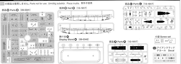 Instructions are well done though mostly in Japanese. colors are in Gunze paint numbers and a color chart is provided. There is no photo etch, though a small note in the back of the instructions shows an aftermarket p.e. and wood deck set. Looking at the parts diagram, you'll see that quite a few of the bits on the B sprue are not used. The small decal sheet (not shown) provides hull number and flags.