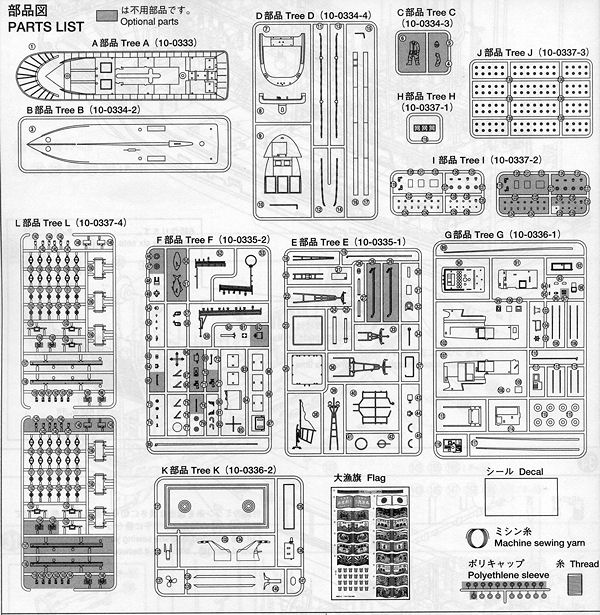 Instructions are very nicely done with parts listed in English and any color information (Gunze paints, of course) that you need supplied. The decal sheet provides base and ship markings for one ship. One even gets some squid on the flag sheet to attach to the jigging lines.